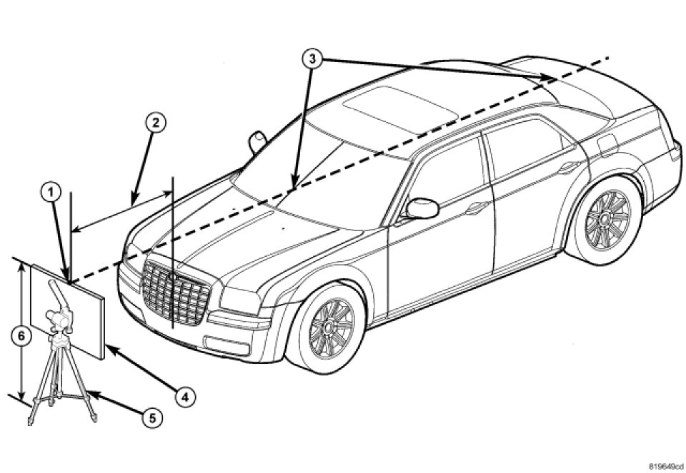 23. Place the aiming board (4) (Special Tool No. 9965) and tripod (5) (Special Tool No. 9649) 4 meters (2) (157.5 inches) from the front of the ACC module and 90 degrees to the front of the vehicle. Ensure that there are no reflective surfaces or objects within 2 m (6.56 ft.) behind the aiming board. Measure from the front of the ACC module grille area to the aiming board.