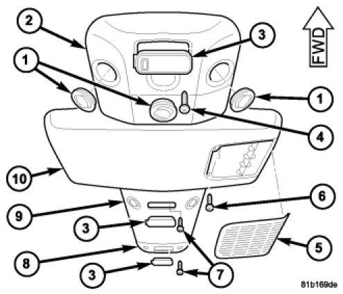 7. Disengage the retaining tabs that secure the air intake grille (5) into the rear evaporator trim panel (10) and remove the grille.