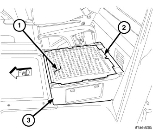1. Position the Programmable Special Module (PSM) to the module mounting strip (3) within the driver side front seat riser (1).