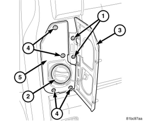 4. Remove the 4 Fuel Filler Tube Panel Fasteners (4) and remove the Fuel Filler Tube Panel (2).