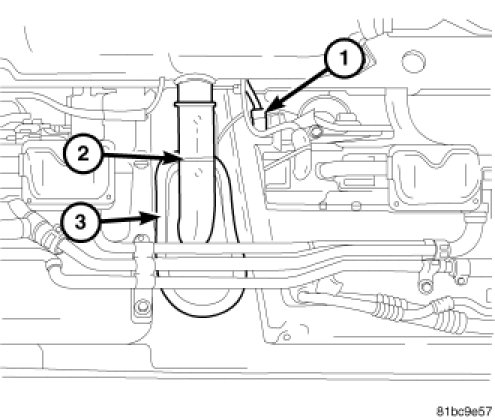 13. Disconnect the Evaporative Emission Vent Line (1) from the Fuel Tank (2).