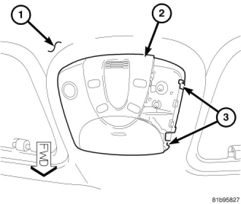 4. Slide the OCP housing toward the left side of the vehicle far enough to engage the two spring clips (3) on the right side of the housing through the right side of the headliner mounting hole.