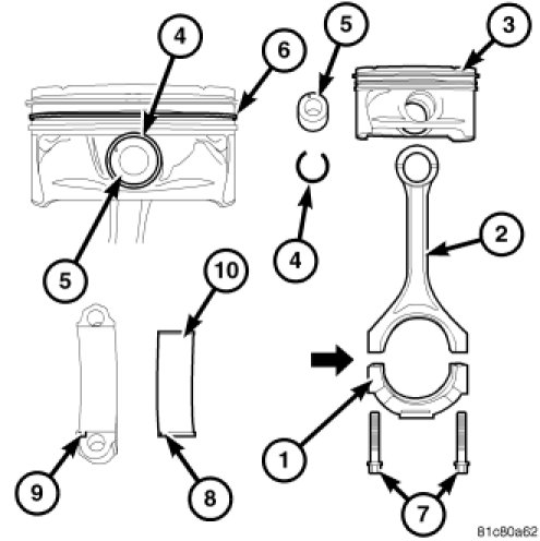The bearing shells must be installed with the tangs (8) inserted into the machined grooves in the rods and caps (9). Install cap with the tangs on the same side as the rod.