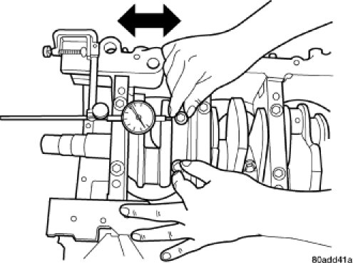 Mount a dial indicator to a stationary point on engine. Locate probe perpendicular to and resting against the connecting rod cap being checked. Move connecting rod all the way to rear of its travel. Zero the dial indicator. Move connecting rod forward to limit of travel and read the dial indicator. Compare measurement to specification listed in engine specifications Repeat procedure for each connecting rod. Turn crankshaft for connecting rod accessibility.