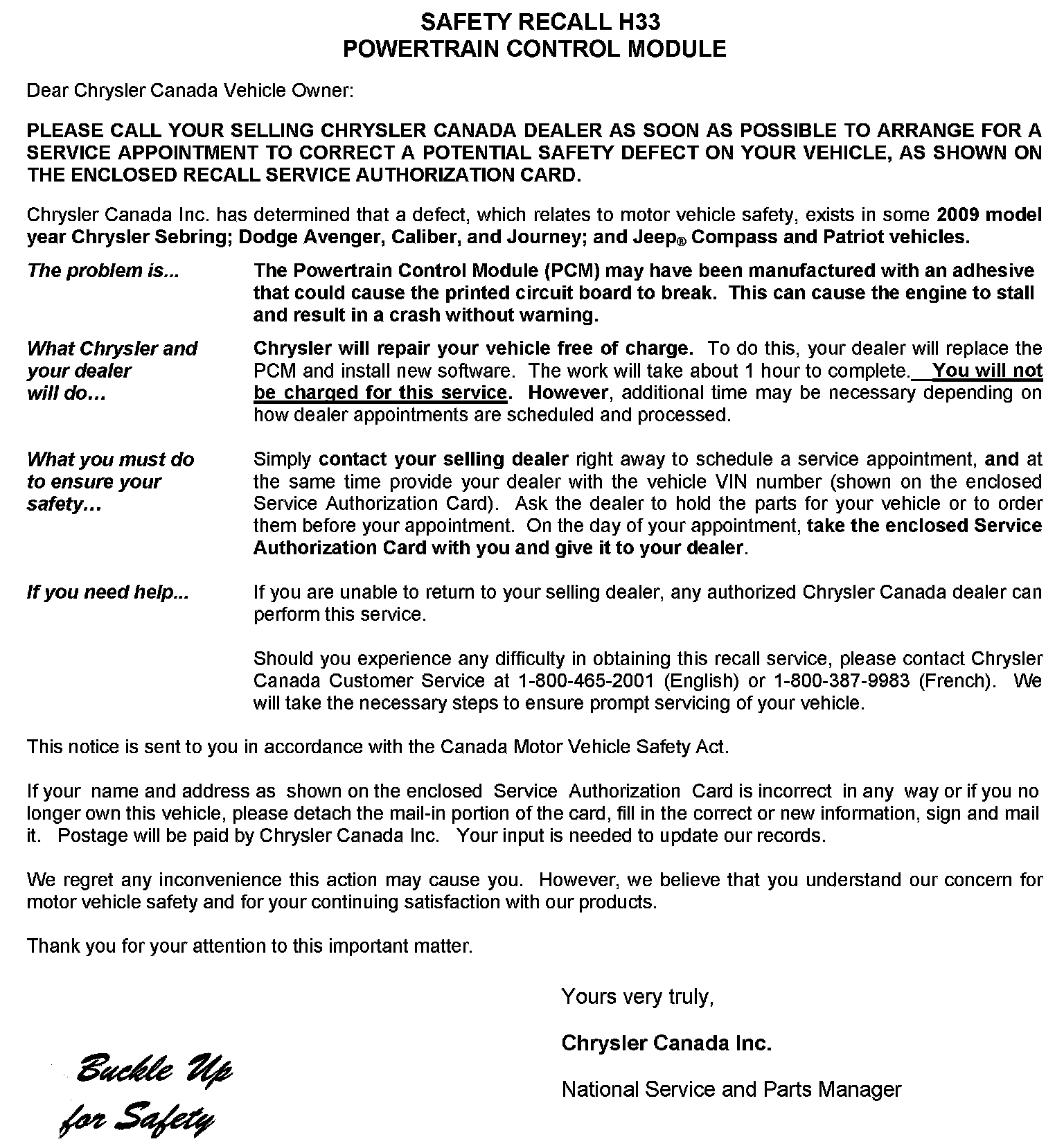 Home >> Dodge and Ram >> 2009 >> Avenger L4-2.4L >> Repair and Diagnosis >> Powertrain Management >> Computers and Control Systems >> Engine Control Module >> Technical Service Bulletins >> All Technical Service Bulletins >> Canada - Recall - H33 Powertrain Control Module