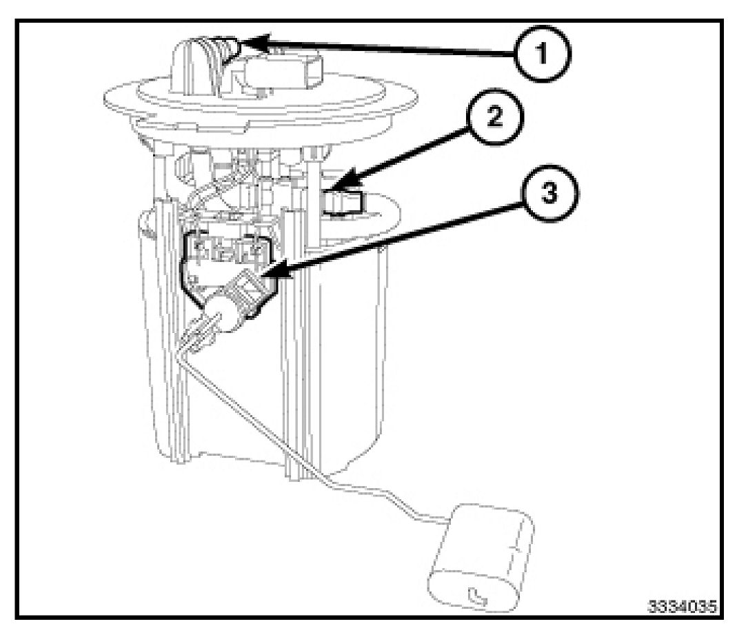 The fuel level sending unit (3) is the only serviceable component of the fuel pump module. If the electric fuel pump, fuel pressure regulator or fuel filter requires service, the fuel pump module must be replaced as an assembly.