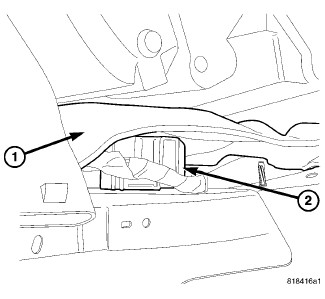 3. Lift, but do not remove, the jute covered panel (1) over the Occupant Restraint Controller (ORC) (2) between the dash panel and the gearshift mechanism as necessary to access the ORC connections and fasteners.