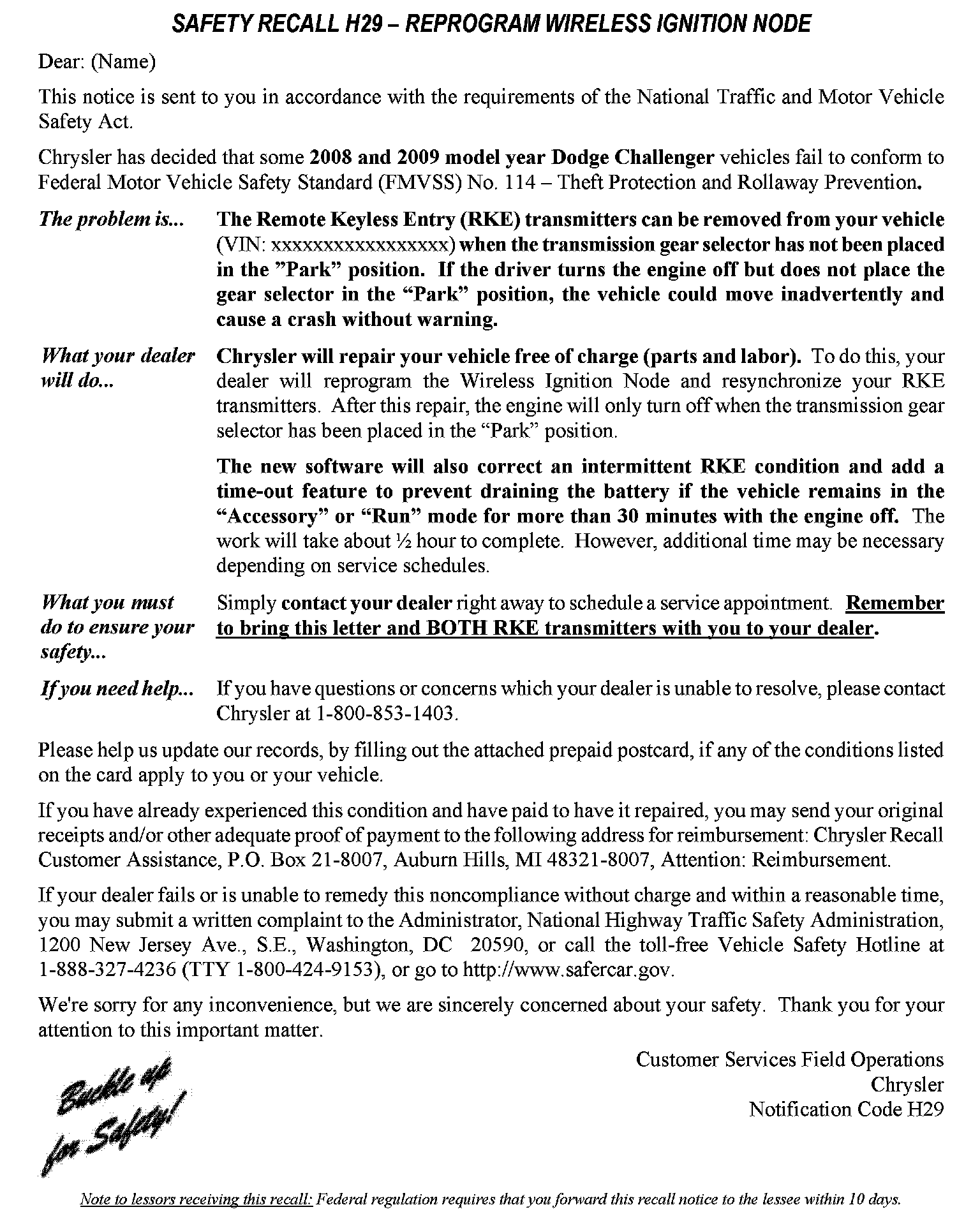 Recall - Keyless Ignition Node Reprogramming