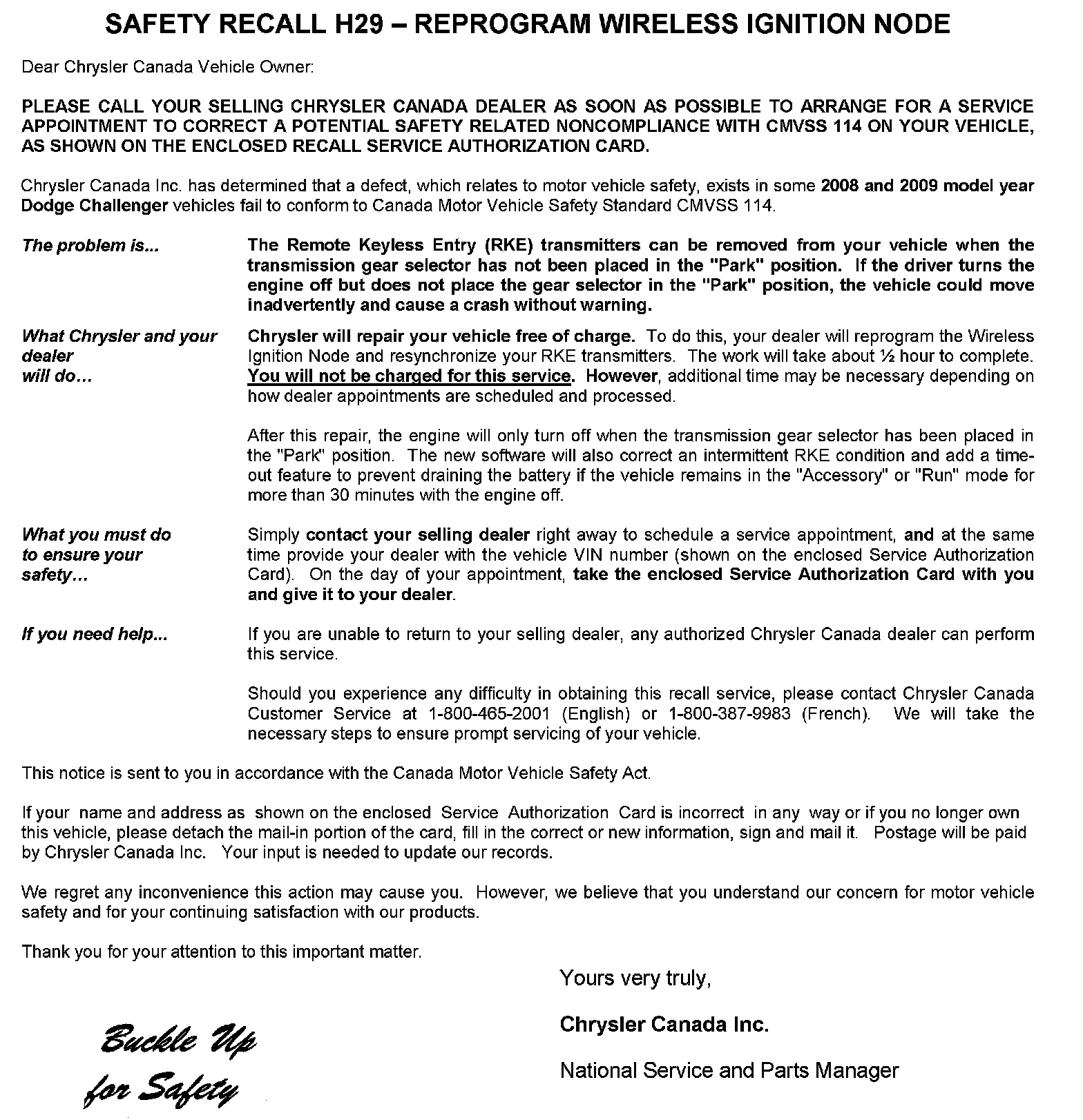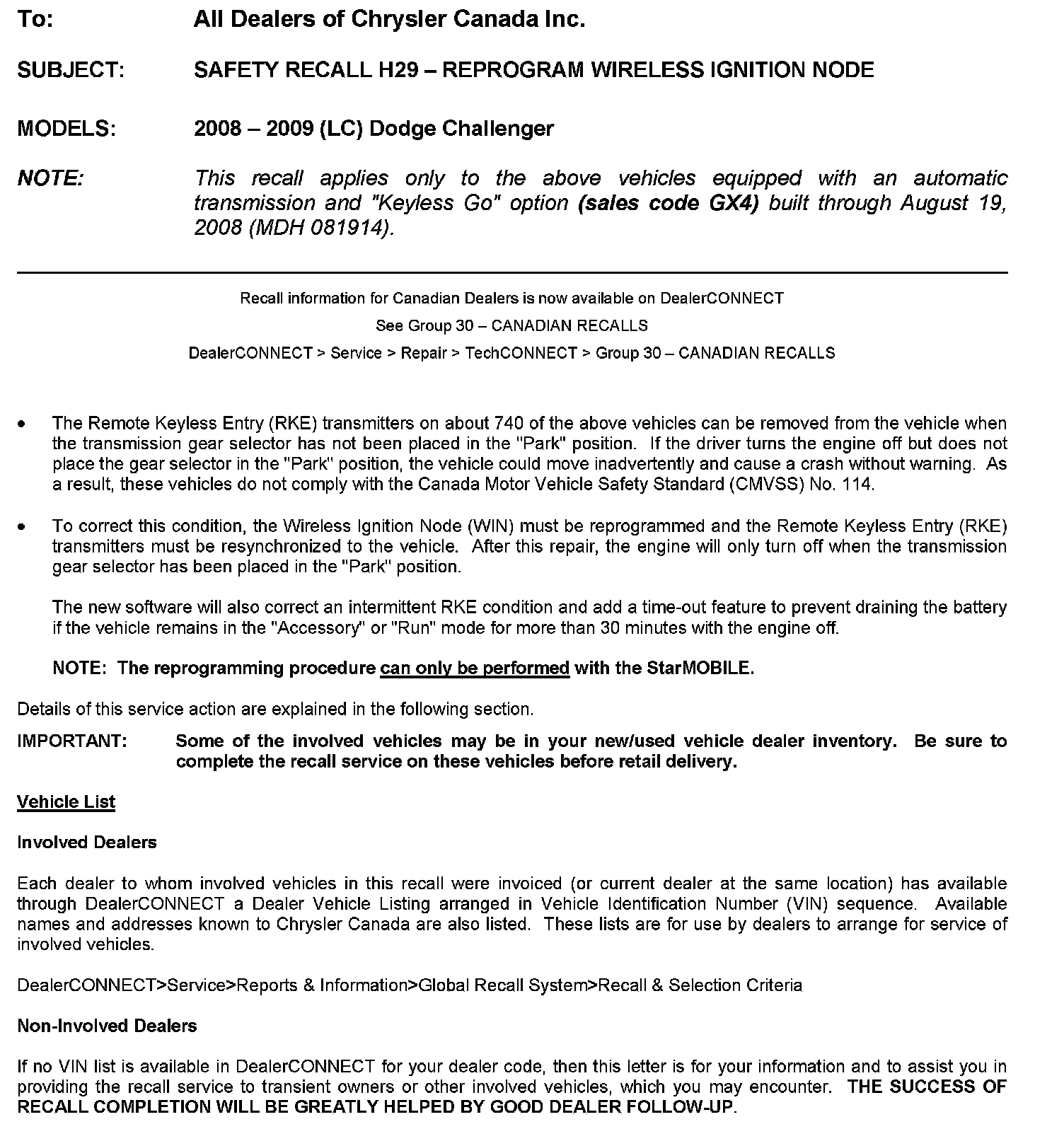 Home >> Dodge and Ram >> 2009 >> Challenger V8-5.7L >> Repair and Diagnosis >> Starting and Charging >> Starting System >> Keyless Starting System >> Keyless Start Control Module >> Technical Service Bulletins >> Recalls >> Canada - Recall - H29 Reprogram Wireless Ignition Node