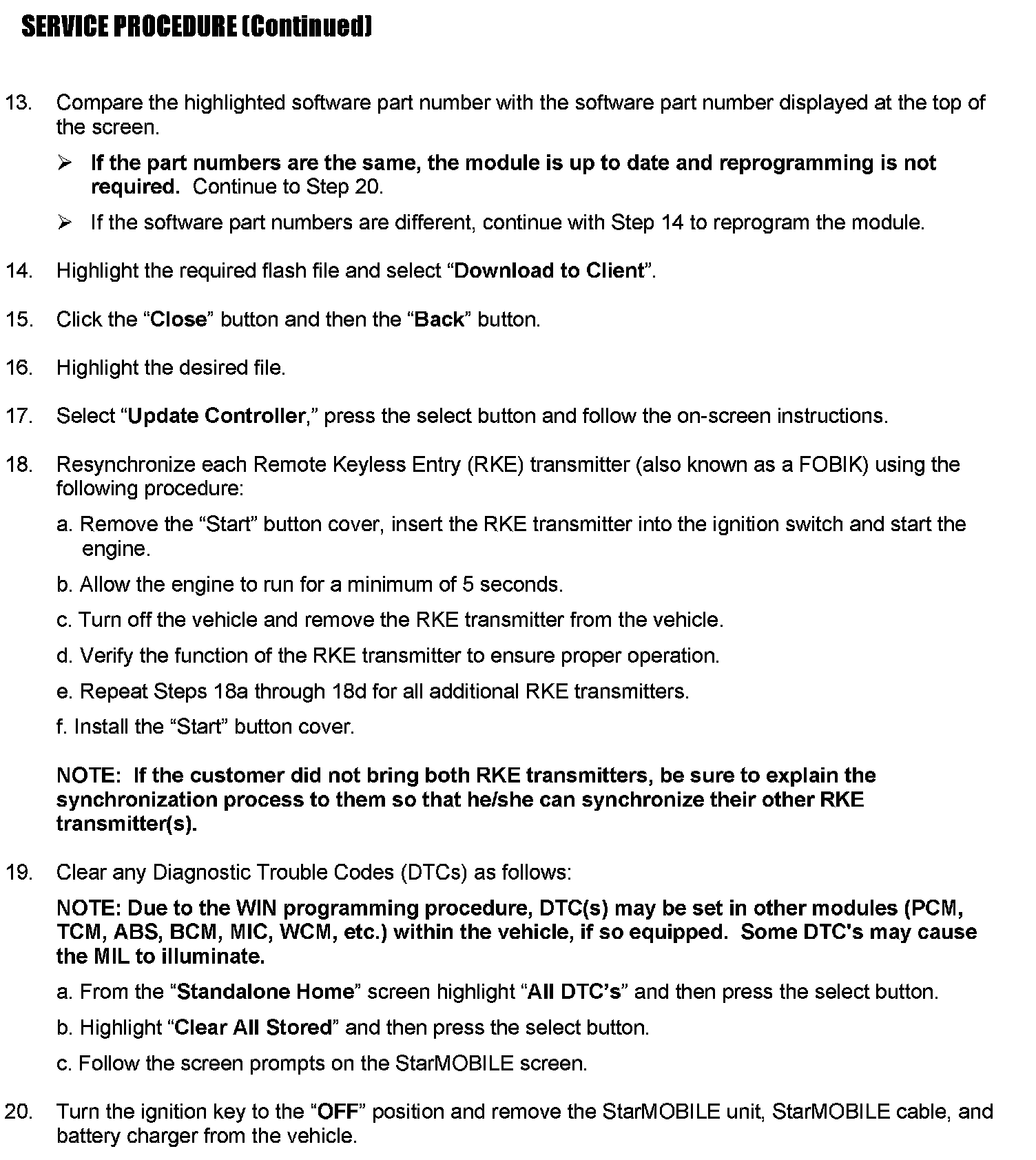 The new software will also correct an intermittent RKE condition and add a time-out feature to prevent draining the battery if the vehicle remains in the "Accessory" or "Run" mode for more than 30 minutes with the engine off.