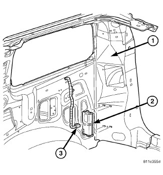 The heated seat module (2) is located behind the right rear D-pillar trim (1). The heated seat module has a single electrical connector (3).