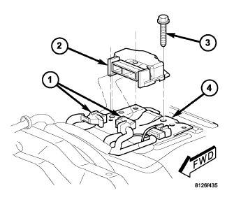 4. Remove the three screws (3) that secure the ORC to the ORC bracket (4) that is welded onto the top of the floor panel transmission tunnel.