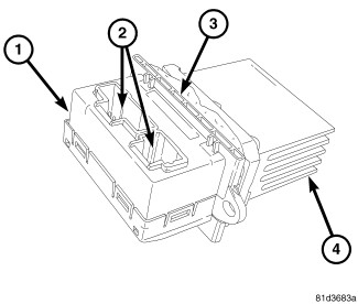 The rear blower motor power module (1) is mounted to the inboard side of the rear heating-A/C housing, located on the right side of the vehicle. The rear blower motor power module consists of a molded plastic housing with two integral wire connector receptacles (2) for the power module electronic circuitry, a mounting plate (3) with a gasket and a finned aluminum heat sink (4).