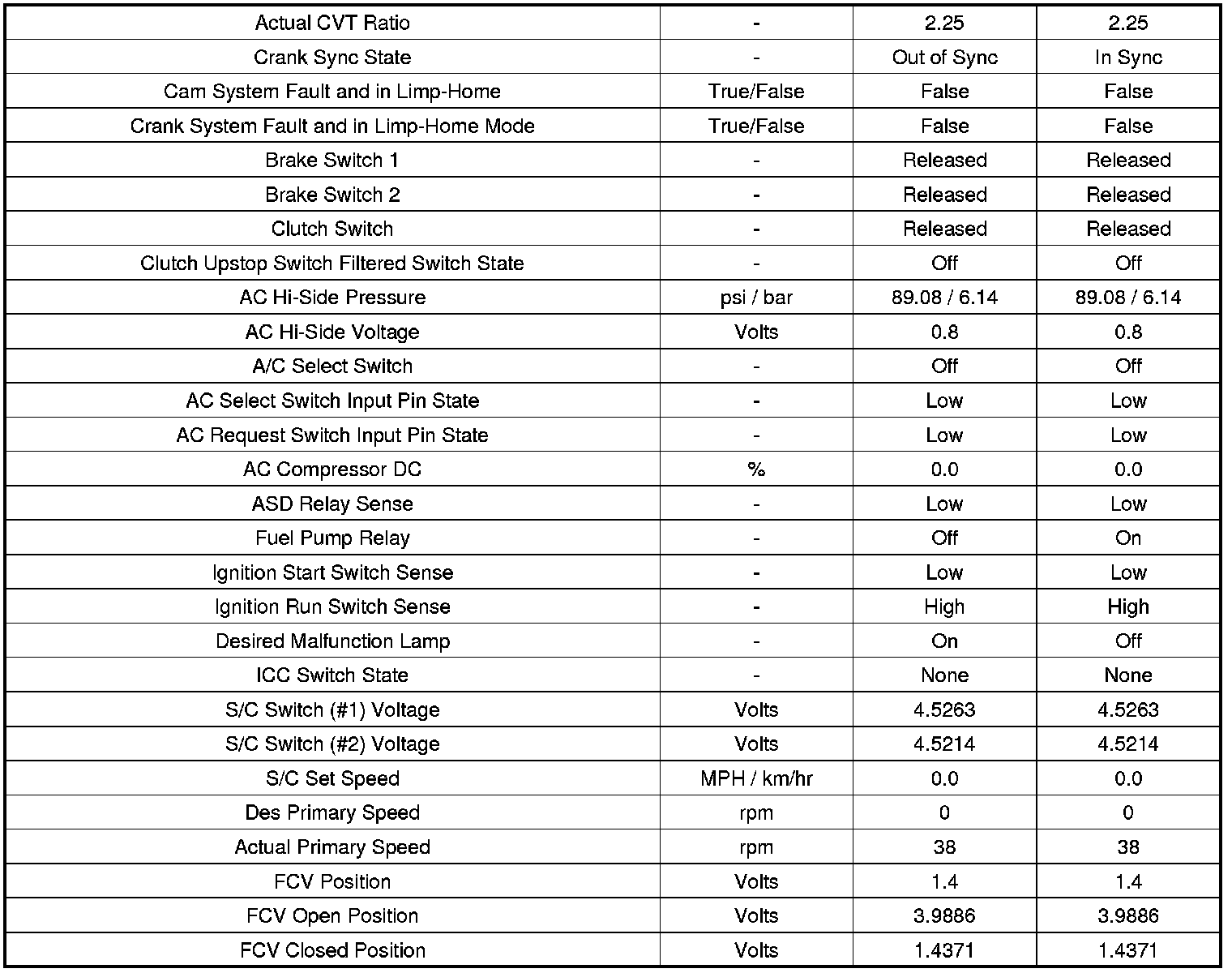 Home >> Dodge and Ram >> 2010 >> Caliber L4-2.0L >> Repair and Diagnosis >> Powertrain Management >> Computers and Control Systems >> Testing and Inspection >> Pinout Values and Diagnostic Parameters >> Scan Tool Data - Powertrain Control Module (PCM/GPEC)