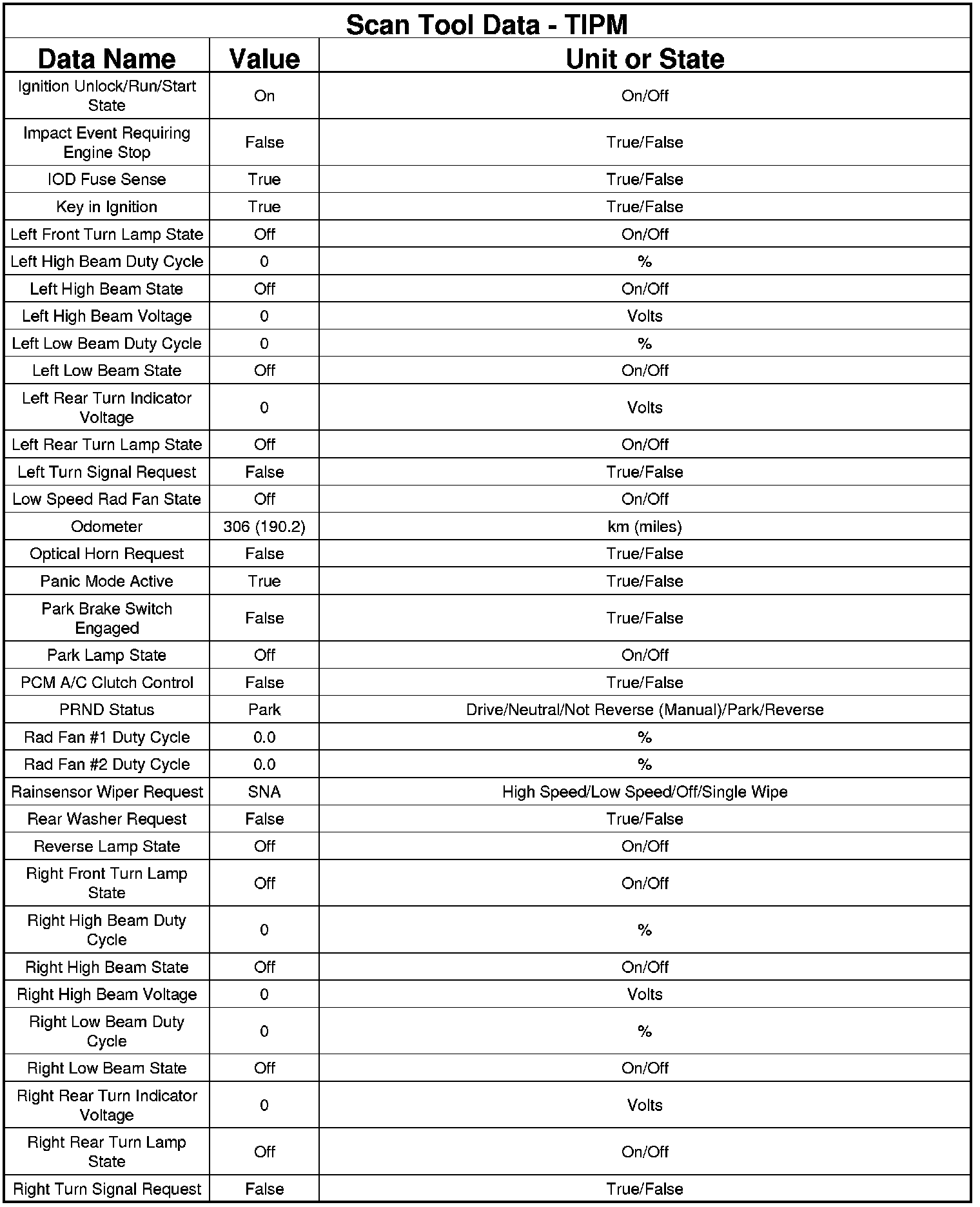 The following chart lists data values taken from the Scan Tool Totally Integrated Power Module (TIPM) data list. The data is to be used for reference only.