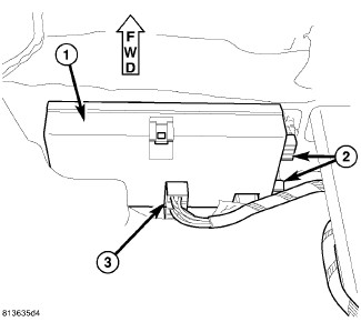 2. Position the tab into the hole in the floor crossmember. Firmly apply even pressure to the heated seat module (3) until the retaining clips (2) snap into place.