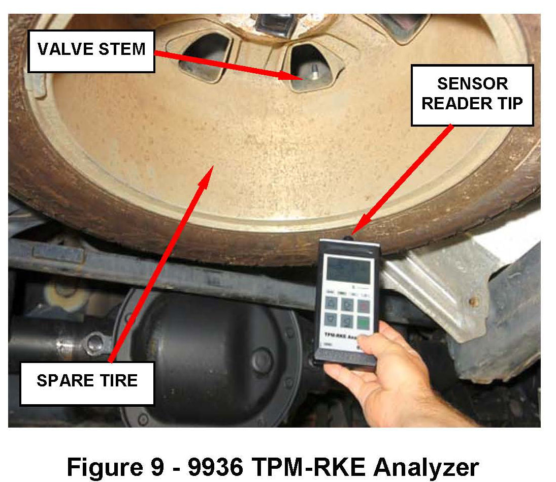 On vehicles equipped with a premium Tire Pressure Monitoring (TPM) system, when the Wireless Ignition Node (WIN) is replaced, the WIN must be programmed with the ID number and location of the spare tire pressure sensor mounted in the wheel of the spare tire. This is done by using Special Tool CH9936 TPM-RKE Analyzer.