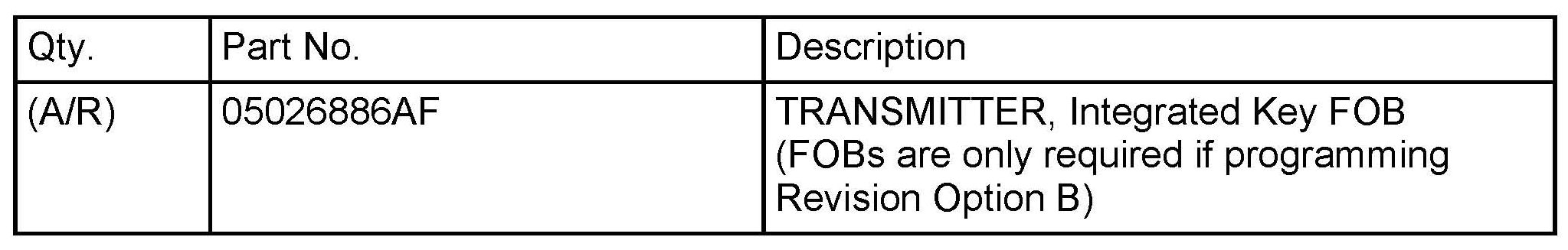 Revision B should only be used when all existing FOBIKs are lost or additional new FOBIKs are required for the vehicle. After this revision is applied, all original FOBIKs will no longer be functional as RKE transmitters. New FOBIKS will then be required for RKE operation. The original FOBIKs will however still start the vehicle. Operation of the vehicle with blade keys is unchanged.