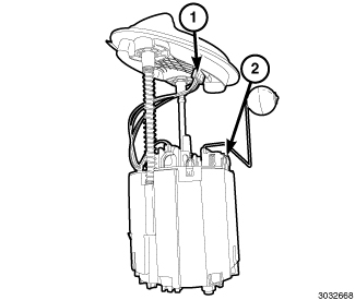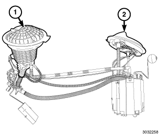 This vehicle uses a saddle type tank that has a reservoir on both sides of the rear drive shaft. The main fuel pump module (2) is located on the left side of the vehicle and is a high flow fuel pump specifically designed for the 6.4L HEMI Engine. The auxiliary fuel pump module (1) is located the right side of the vehicle. The fuel outlet or fuel supply line is on the auxiliary fuel pump module (right side) and supplies fuel to the engine. The electrical connector is on the main fuel pump module (left side) and controls both modules. The fuel pressure regulator is integrated into the auxiliary fuel pump module and is not a serviceable component.