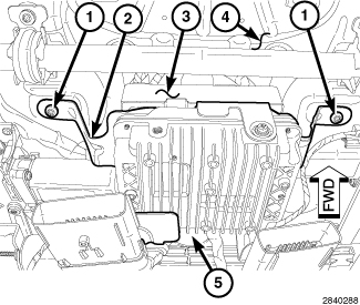 4. Position the bracket (2) containing the Heated Seat Module (HSM) (3) to the underside of the seat cushion frame (4) and engage the metal bracket retaining tab (5) to the seat cushion frame.