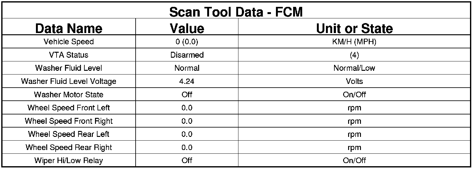 The following chart lists data values taken from the Scan Tool Front Control Module (FCM) data list. The data is to be used for reference only.
