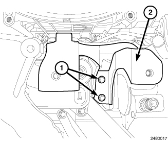 2. Install the mixing chamber support bracket (2). Tighten bolts (1) to 9 Nm (80 in. lbs.).