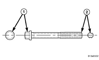 The adjustment bolt package contains 2 special bolts (1). These bolts can be identified by the offset grooves cut into the thread section (2). These bolts are designed to replace the inboard mounting bolts of the lower control arm and tension strut. Each bolt allows approximately 0.3 degrees of movement. To adjust camber only, use both bolts, one at the tension strut and the other at the lower control arm. To adjust caster only, use one bolt at the tension strut only.