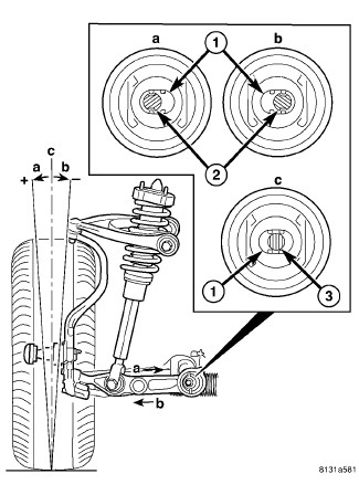 NOTE: The grooves on the adjustment bolts are off-center forcing the bolt to be installed in one of two ways depending on whether more positive or negative camber or caster is necessary. The Bolts must be rotated 180° to achieve either more positive or negative camber or caster. DO NOT force the adjustment bolt.