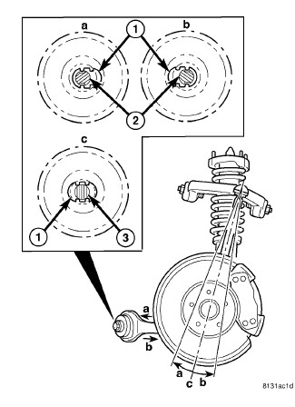 NOTE: When adjusting rear toe, the eccentric lobes on the toe adjustment cam bolts and washers are not to be facing downward. The lobes should only be facing upward or up to 90° to one side or the other from the 12 O'clock position.