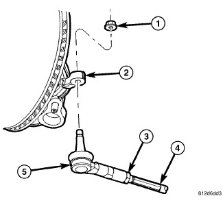 1. Loosen the jam nut (3) at the inner-to-outer tie rod (4-5) connection.