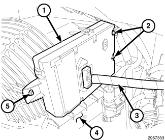 1. Position the A/C heater module (1) to the air inlet housing (4) and engage the module to the two front retaining screws (2).