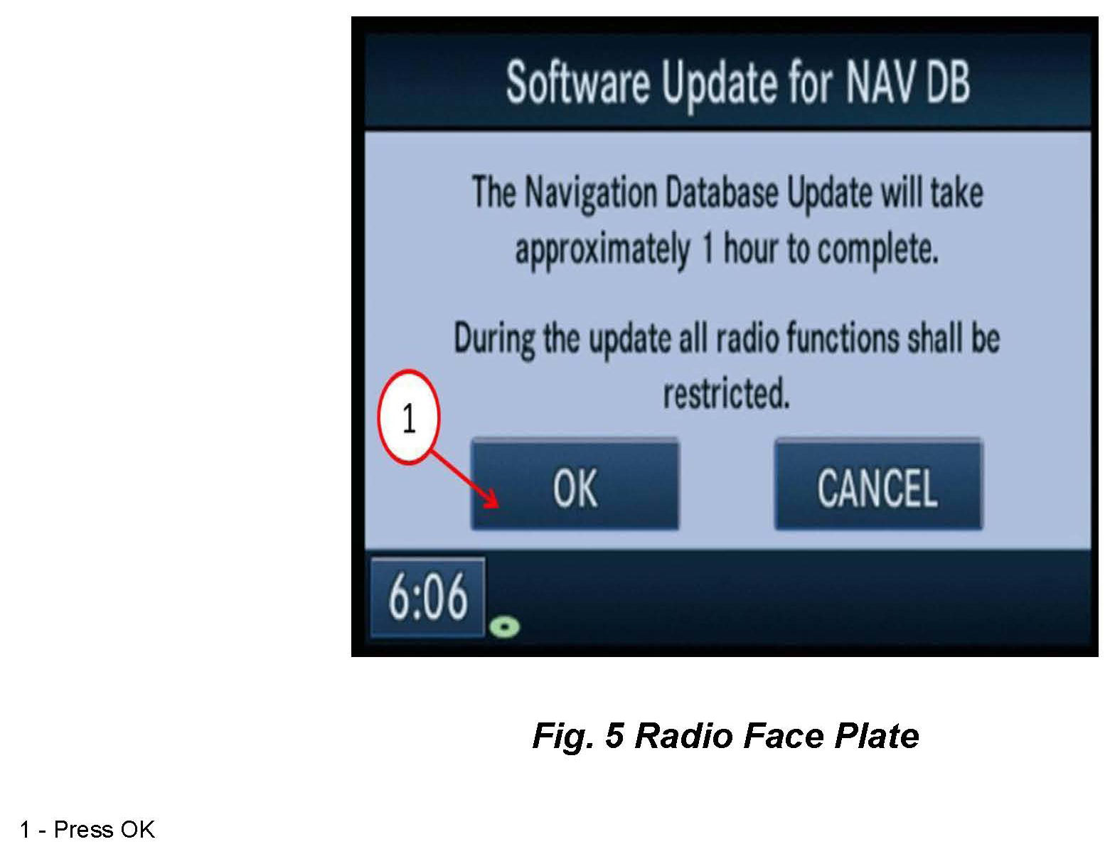 10. The radio will read the contents of disc and will prompt the user to select "OK" or "CANCEL" as shown in the screen below. It may take approximately 2 minutes for this prompt to display (Fig. 5).