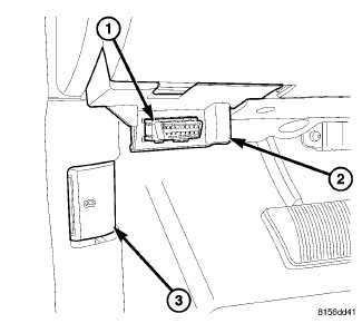 The Data Link Connector (DLC) (1) is a 16-way molded plastic connector insulator on a dedicated take out of the instrument panel wire harness. This connector is located at the lower edge of the instrument panel, outboard of the steering column. The connector insulator is retained by integral snap features within a rectangular cutout in a mounting bracket (2) integral to the lower instrument panel base trim, just below the lower edge of the instrument panel steering column opening cover and inboard of the inside hood release (3) on the inner cowl side trim.