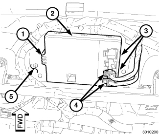 1. Position the Heated Seat Module (HSM) (2) to the driver seat and engage the two outboard HSM retaining tabs (3) to the seat bottom pan (5). Make sure the retaining tabs are correctly engaged to the seat bottom pan.