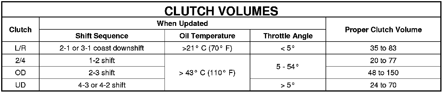 Certain mechanical problems within the clutch assemblies (broken return springs, out of position snap rings, excessive clutch pack clearance, improper assembly, etc.) can cause inadequate or out-of-range clutch volumes. Also, defective Input/Output Speed Sensors and wiring can cause these conditions. The following chart identifies the appropriate clutch volumes and when they are monitored/updated: