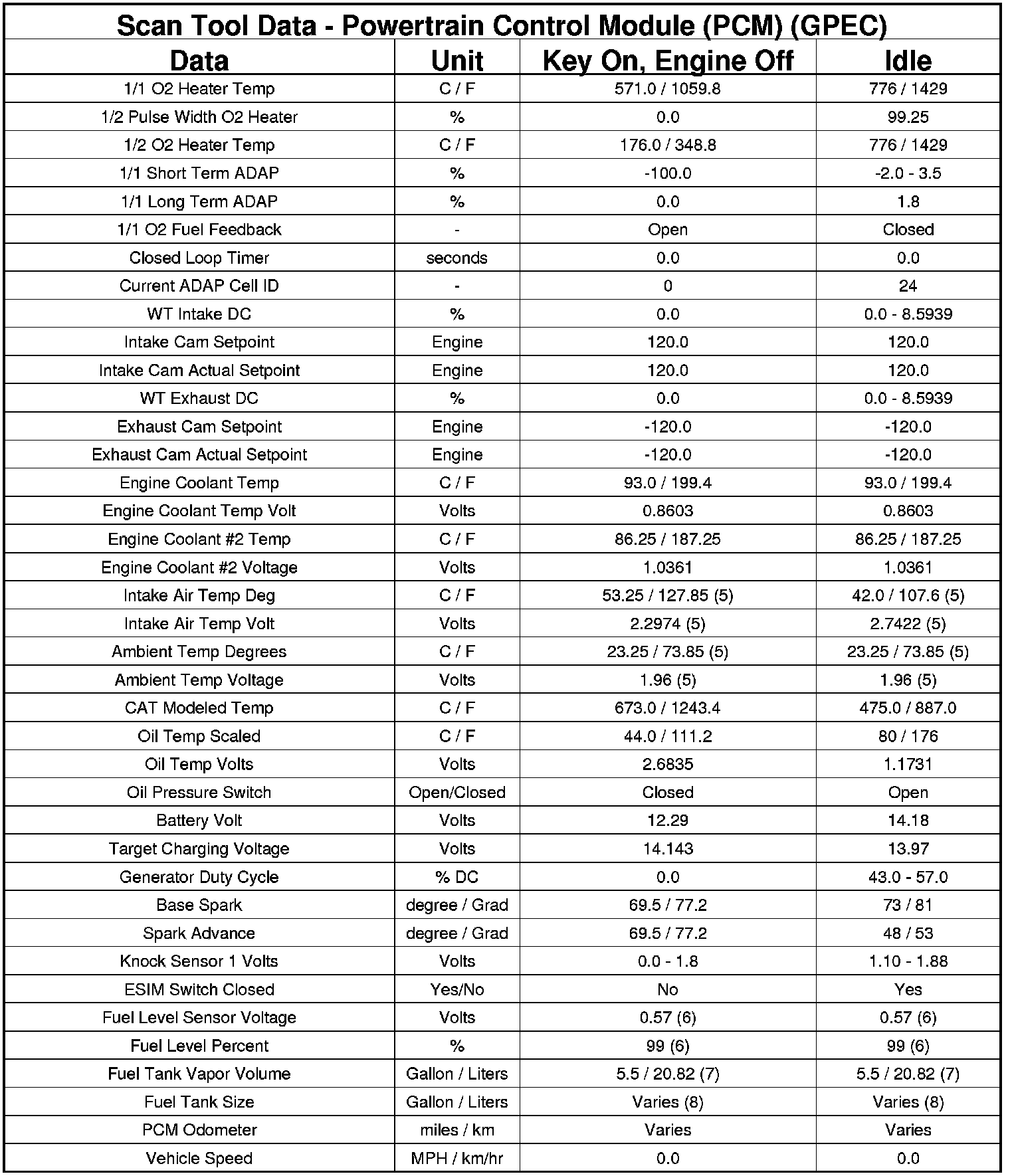 The following chart lists data values taken from the Scan Tool Powertrain Control Module (PCM) data list for the GPEC controller. The values were taken at key on, engine off and at idle. The data is to be used for reference only.