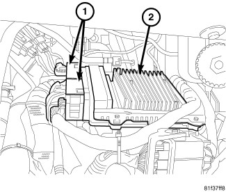 2. Unlock and disconnect the 2 electrical connectors (1) at the PCM (2).