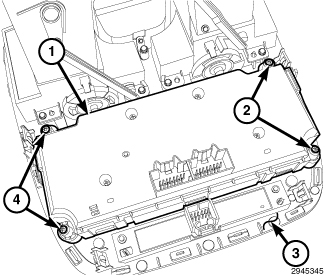 2. Install the four screws (2 and 4) that secure the A/C-heater control to the center bezel. Tighten the screws to 2 Nm (17 in. lbs.).