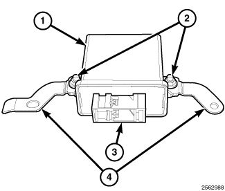 The molded black plastic AHLM housing has integral mounting flanges that are secured to two studs (2) on a stamped metal mounting strap (4) by two nuts. Two additional nuts secure the mounting strap to two studs located on the top of the left inner rear wheel housing. Concealed within the housing is the circuitry of the module, which includes a microprocessor. The module is connected through an integral connector receptacle (3) to the vehicle electrical system by a take out and connector of the body wire harness. The AHLM is concealed behind the left quarter inner trim.