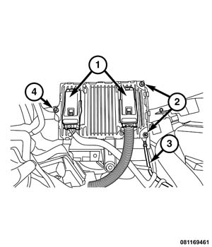 NOTE: The ground strap (3) for the PCM is located at the lower most forward stud. It is not required to remove the ground wire from the stud unless replacement is required.
