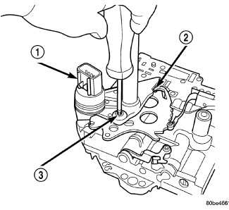 Install Transmission Range Sensor (TRS) (1) to the valve body and torque retaining screw (3) to 5 Nm (45 in. lbs.).