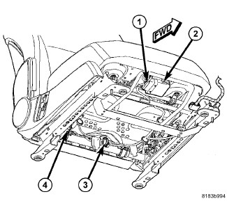 The Heated Seat Module (HSM) is located under the driver front seat. It has a single electrical connector (1) and a push pin style retainer that secures it to the seat pan (4). The module can be accessed from under the Driver seat with the seat in the full back and up position.
