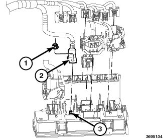3. Install the B+ cable (2) to the TIPM stud (3).