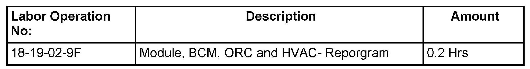 This bulletin involves updating the software in the Body Control Module (BCM), Occupant Restraint Controller (ORC) and Heating Ventilation Air Conditioning (HVAC).