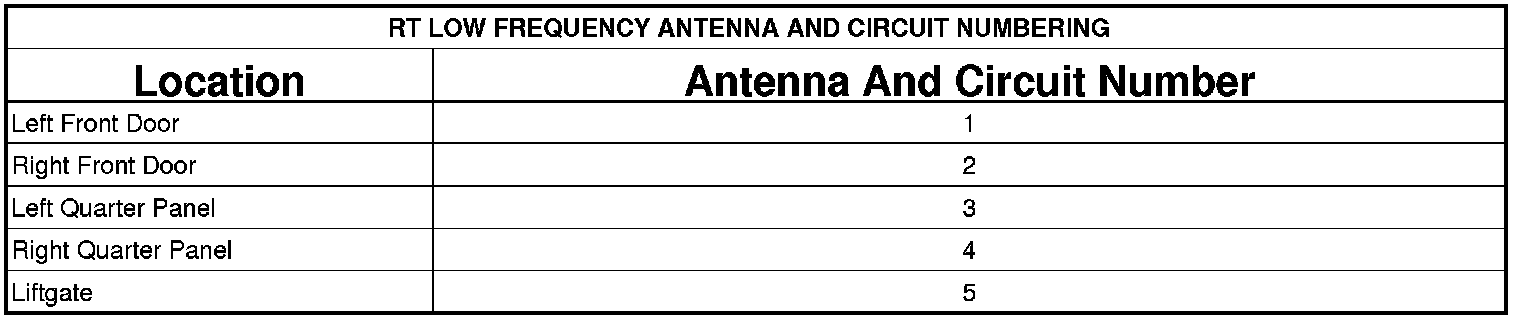 The number of antennas and the specific antenna locations are designed to ensure complete vehicle interior coverage. The LF antennas are each numbered and connected to the PEM on dedicated and sequentially numbered circuits. This arrangement allows the PEM to localize the positions of transmitting FOBIK units using a triangulation strategy. See the RT Low Frequency Antenna And Circuit Numbering table.