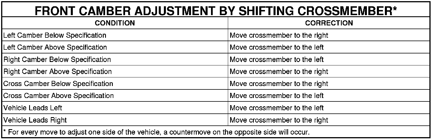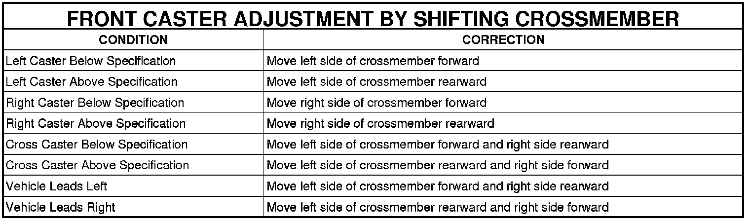 3. Shift front crossmember as necessary (See following tables) to bring camber or caster into specifications. When shifting crossmember, use care not to move other angles (camber or caster) that are within specifications, out of specifications.