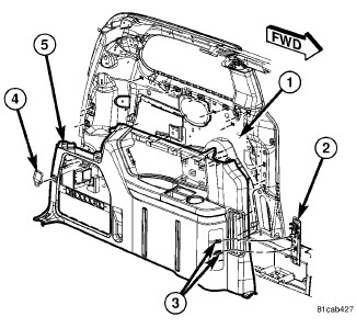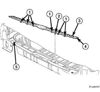 b. Carefully disengage the scuff plate end tabs (4) from the left and right quarter trim panels (5).