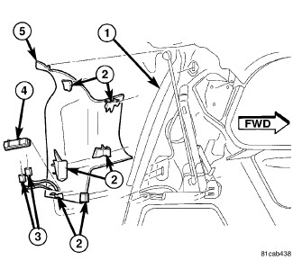 b. Carefully disengage the upper D-pillar trim end tab (5) from the rear header trim plate.