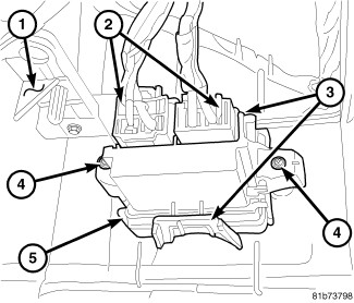 1. Position the blower motor power module (5) to the front HVAC housing (1) and engage the two retaining tabs (3). Make sure the retaining tabs are fully engaged.