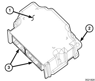 The EPPM housing has three integral mounting tabs (2) and an integral locating pin. A molded plastic electrical connector (3) with two receptacles containing numerous terminal pins, exits the downward facing side of the EPPM housing. These terminal pins connect the EPPM to the vehicle electrical system through two dedicated take outs and connectors from the body wire harness.